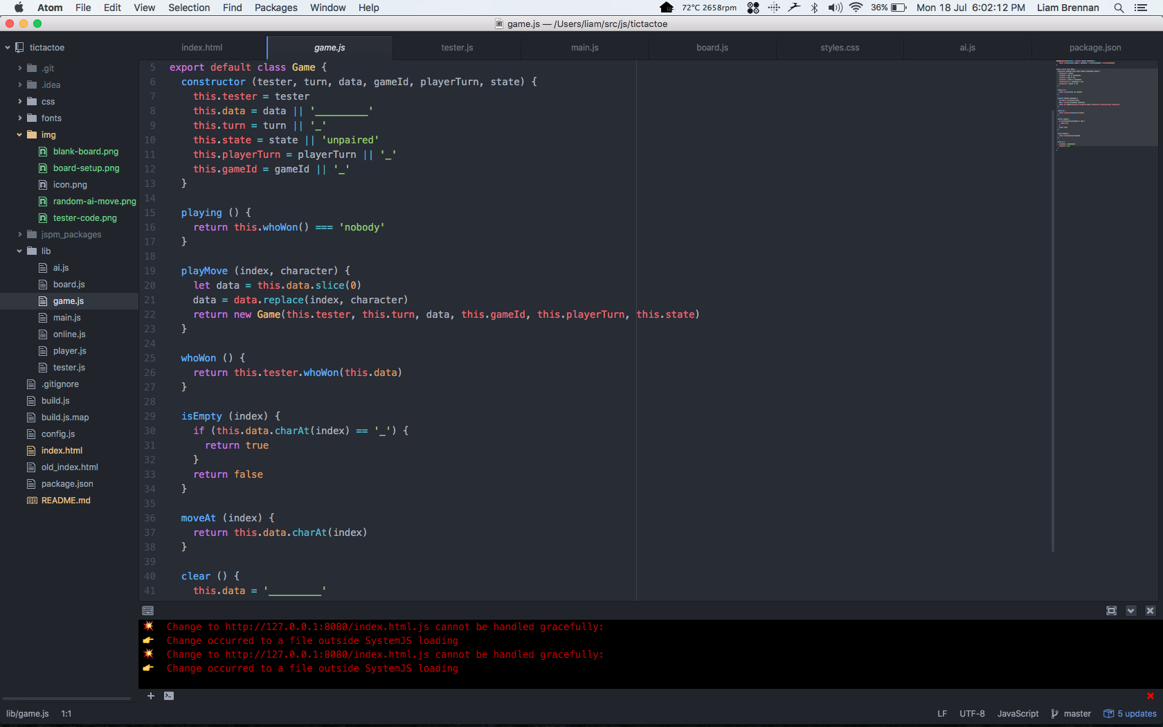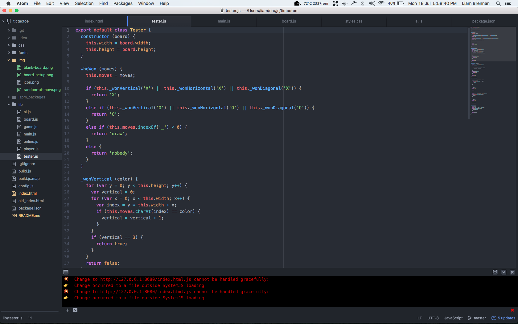 I also put together a game class to hold data like whose move it is, game state and other information so that it can all be bundled to be passed around more easily. The game class also holds the tester because it is quicker to call a whoWon() function directly from the game object.