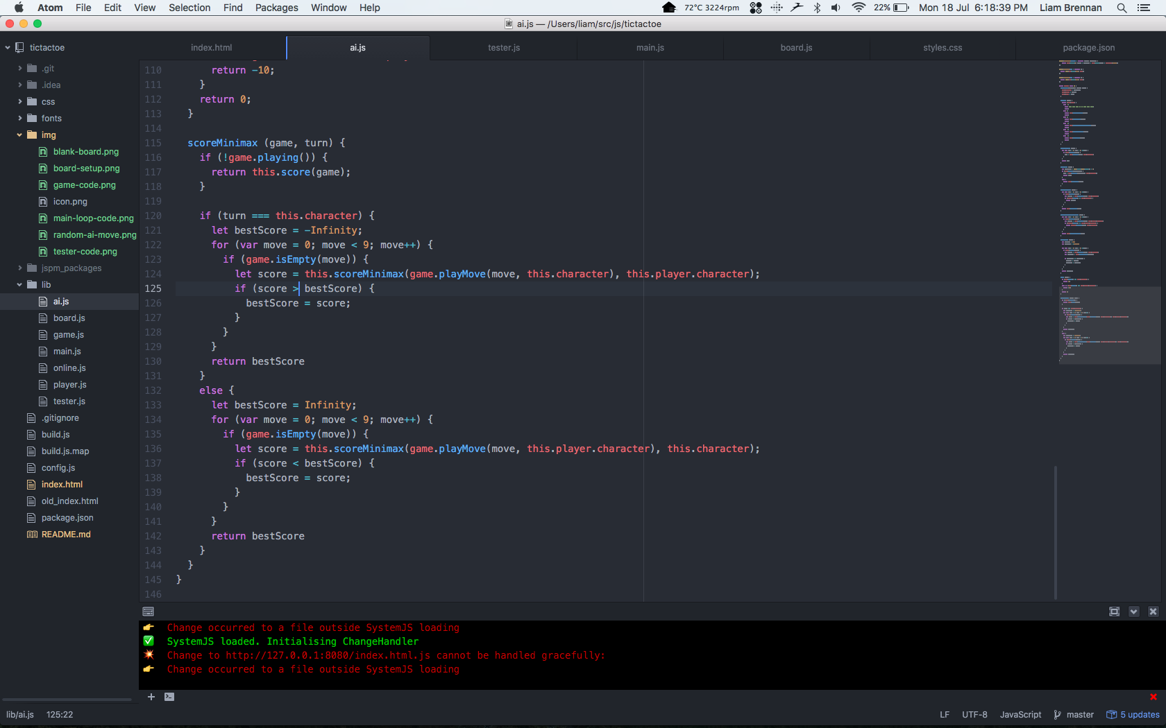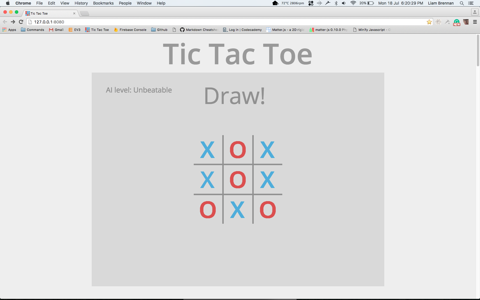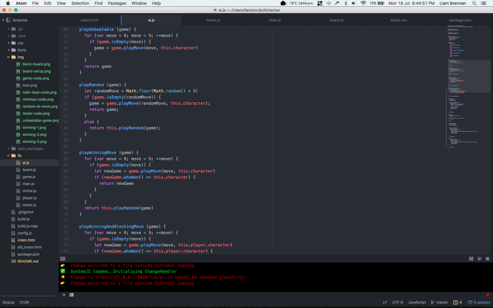 Most of the code for this game is to build the board, draw it and take user input. In the end only about 50 lines of code is needed for the perfect Ai. I used Babel to code in the latest version of javascript (es6) and went form there. I also opened a git repo here to keep my code safe.